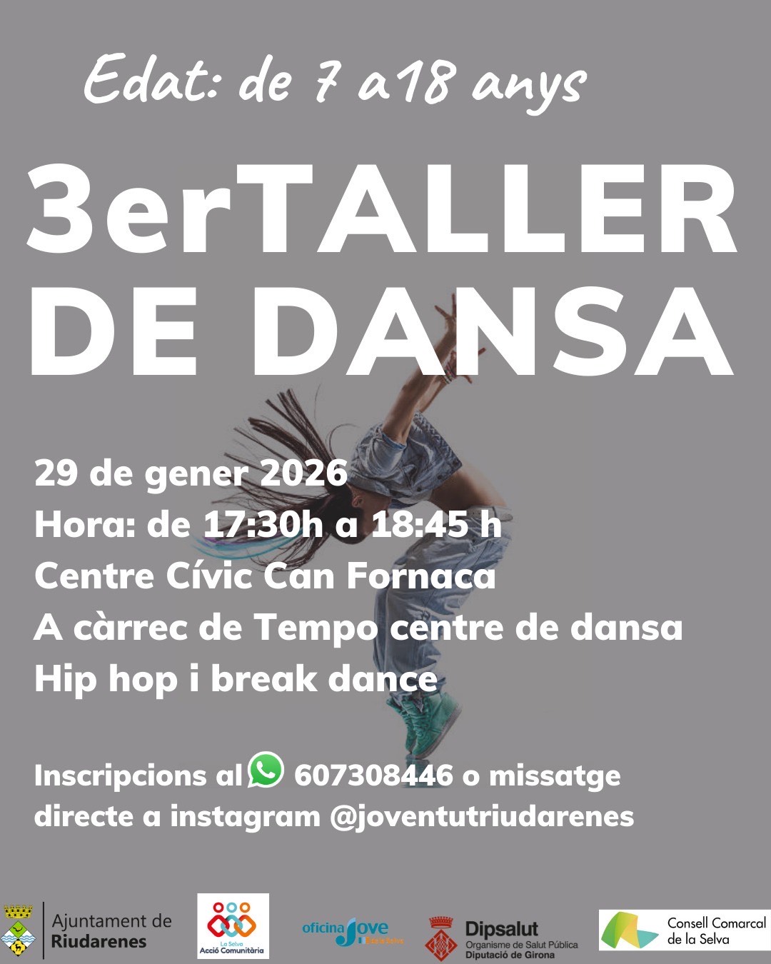 3r taller gratuït de dansa urbana, hip-hop i break dance, per a joves de 7 a 18 anys. Lloc: centre cívic can Fornaca, Riudarenes. Dia: 29 de gener de 2026 Hora: 17:30 h a 18:45 h Amb inscripció prèvia via: Missatge directe a Instagram @joventutriudarenes Per Whatsapp al 607308446 Tallerista: Tempo centre de dansa