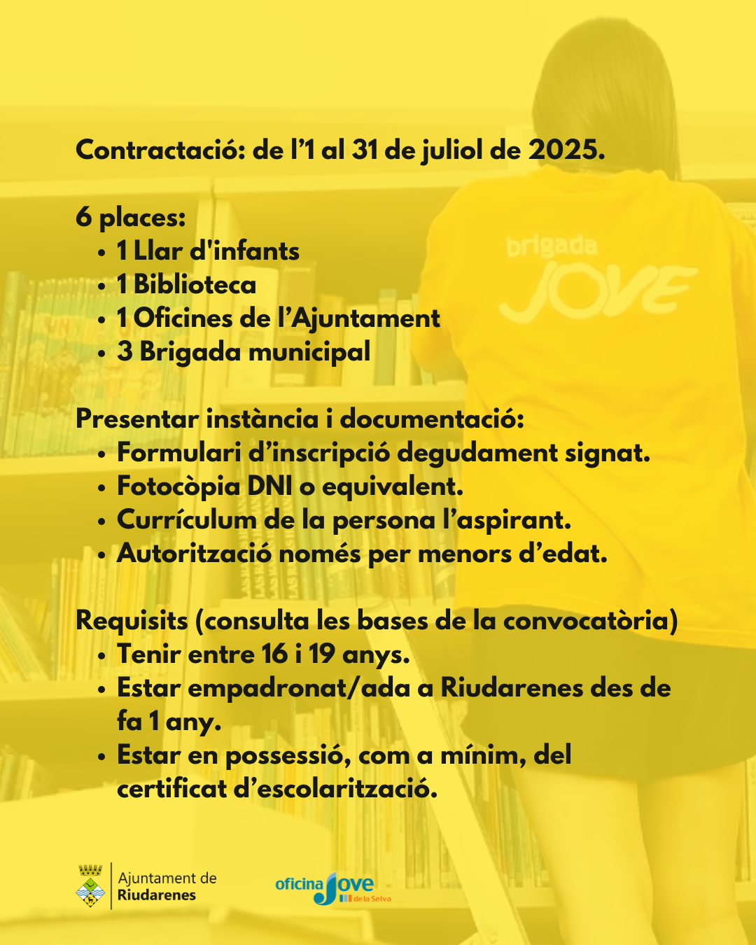 La Junta de Govern Local, en sessió ordinària de data 16 d’abril de 2025, va aprovar les bases reguladores i convocatòria del procés de selecció per a la contractació temporal de 6 joves en el marc del projecte “Brigada Jove de Riudarenes – Estiu 2025”.