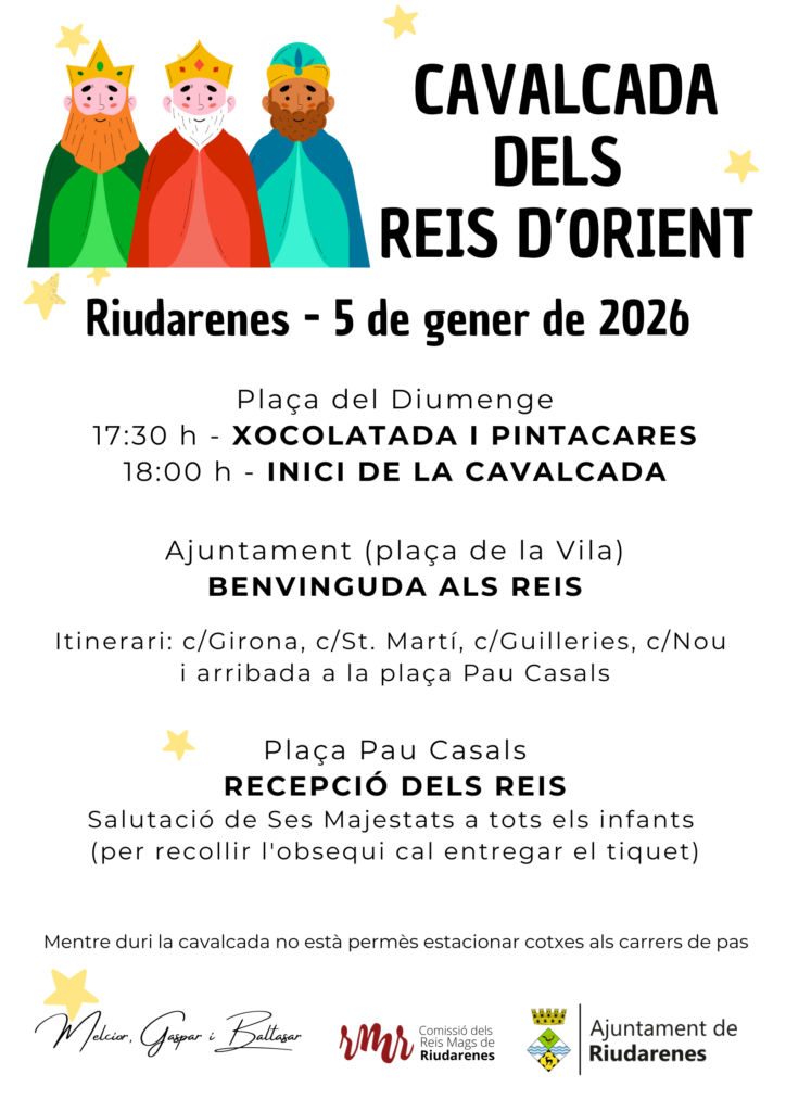Un any més, Melcior, Gaspar i Baltasar ens han telefonat per confirmar que el dia 5 de gener passaran per Riudarenes, per saludar a tots els nens i nenes, carregats de regals i una mica de carbó.