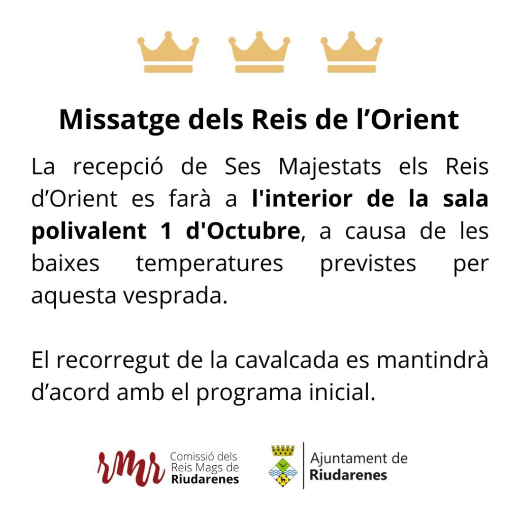 La recepció de Ses Majestats els Reis d’Orient es farà a l’interior de la sala polivalent 1 d’Octubre, a causa de les baixes temperatures previstes per aquesta vesprada.