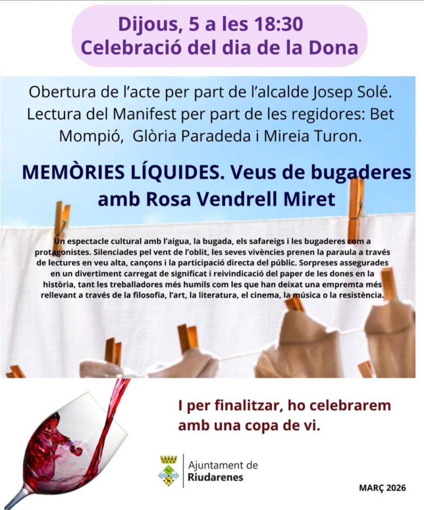 A continuació, l’espectacle Memòries líquides. Veus de bugaderes, amb Rosa Vendrell Miret, una proposta cultural i reivindicativa que dona veu a les dones i al seu paper en la història.