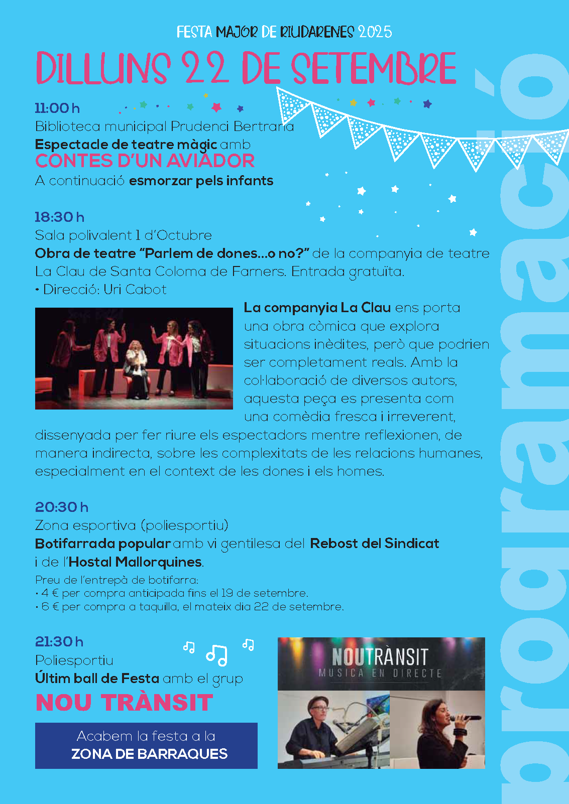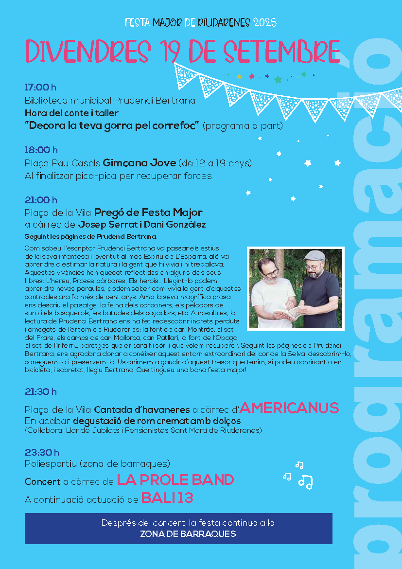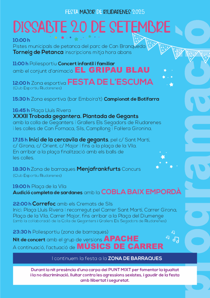 Enguany, celebrarem la Festa Major de Riudarenes els dies 19, 20, 21 i 22 de setembre.