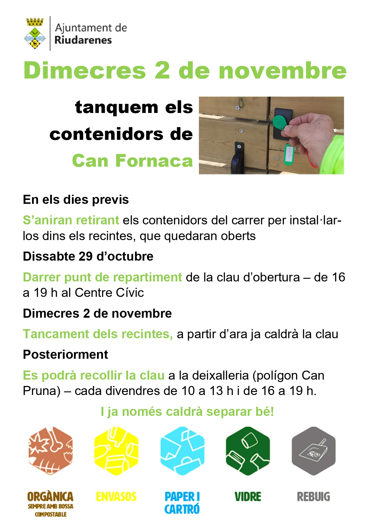 Noticies municipals OBERTURA DELS RECINTES DE CONTENIDORS A CAN FORNACA 20/10/2022 < Entrada AnteriorEntrada Posterior >